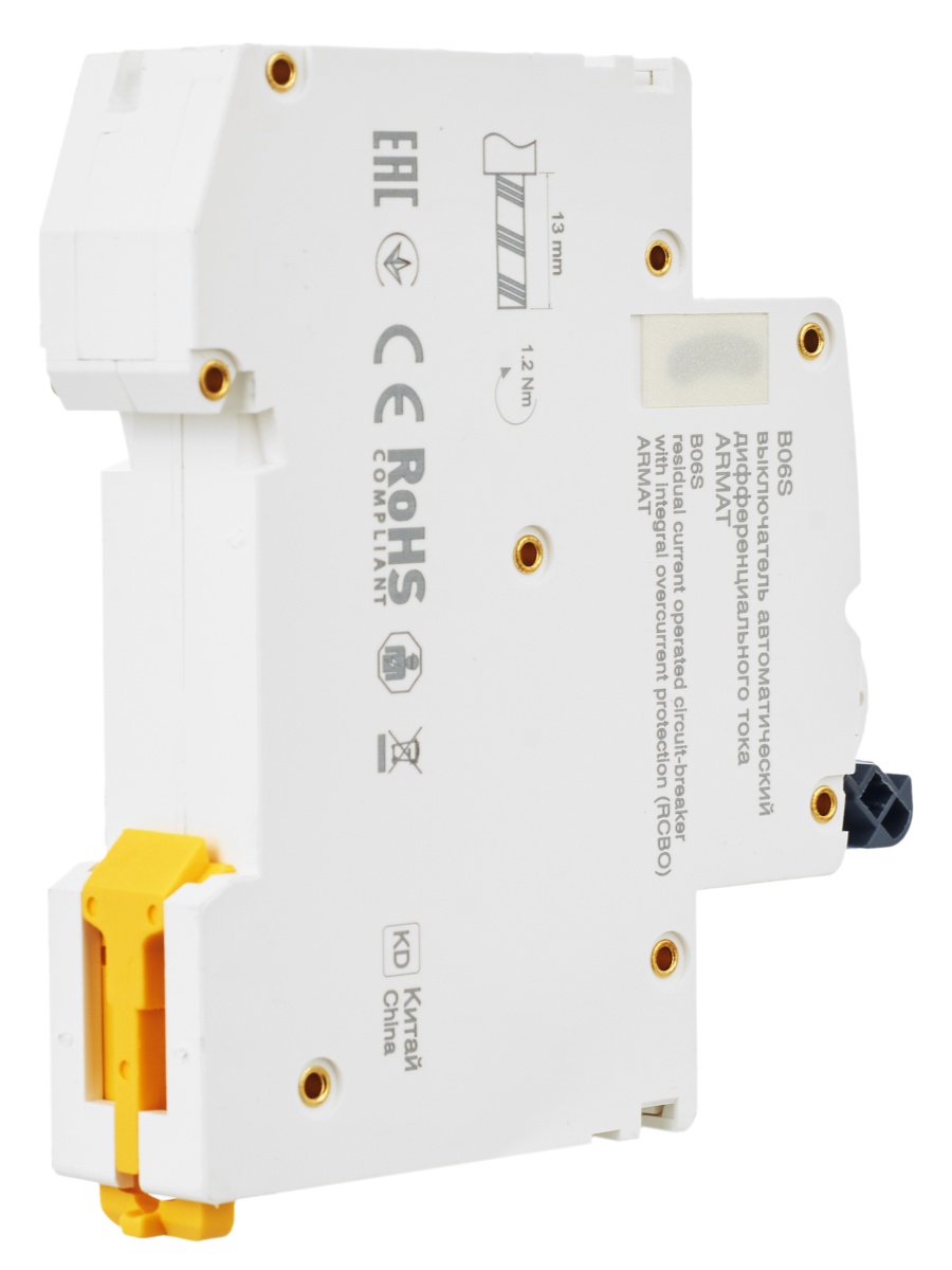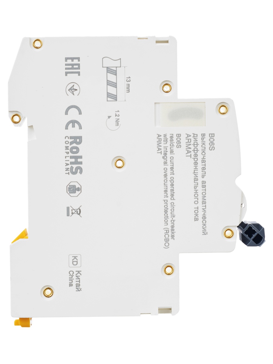 Наименование в прайсе производителя ARMAT Автоматический выключатель дифференциального тока B06S 1P+NP C13 30мА тип A (18мм)