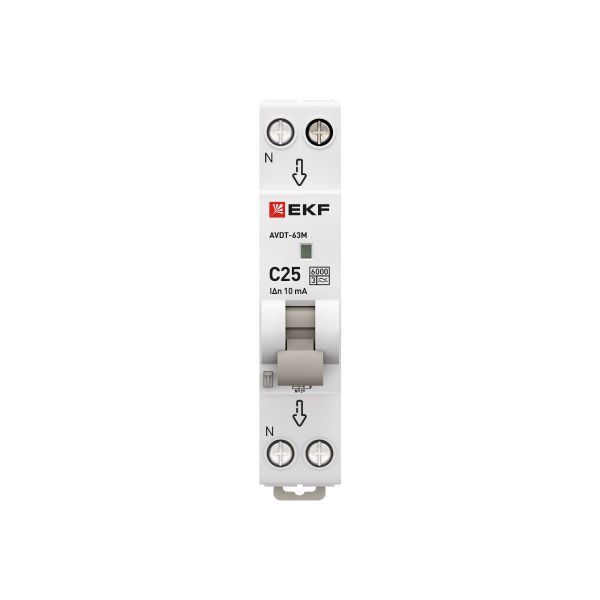 Наименование в прайсе производителя Дифференциальный автомат АВДТ-63М 25А/10мА (1мод, хар, C, электронный, тип A) 6кА EKF PROxima