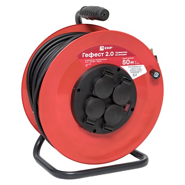 Удлинитель на катушке "Гефест 2,0" 4 гнезда 50м с заземлением и предохранителем КГ 3*2,5 16А/3,5кВт IP44 PROxima | код UKG02-16-R325-4-50-IP44 | EKF