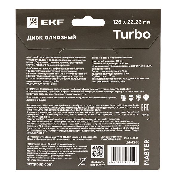 Наименование в прайсе производителя Диск алмазный Turbo (125х22,23 мм) EKF Master