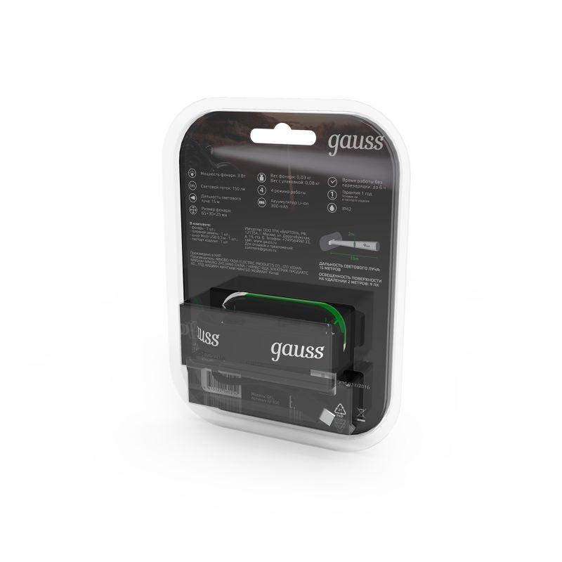 Фонарь налобный светодиодный LED 3 Вт 150 Лм модель GFL408 черный c Li-ion аккумулятором 300 мАч Gauss | код GF408 | GAUSS