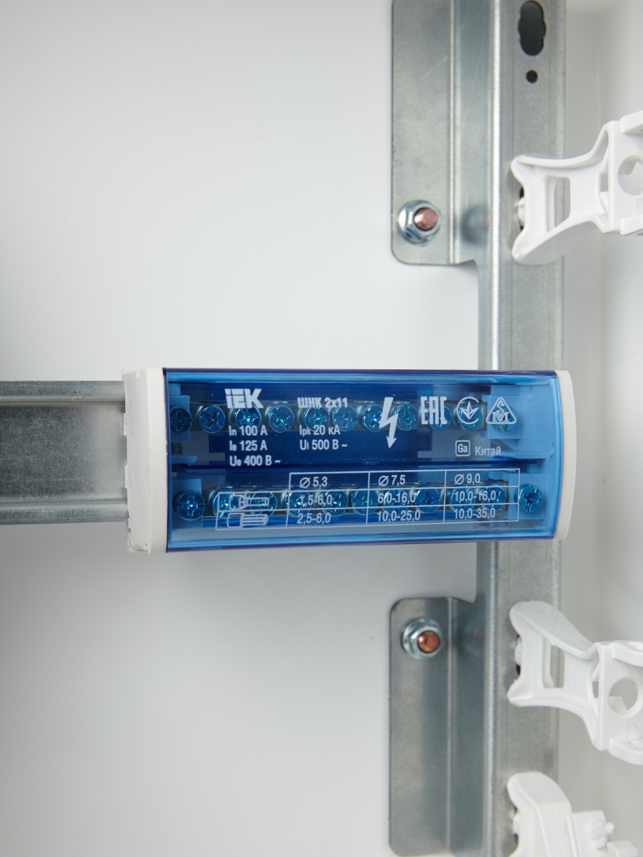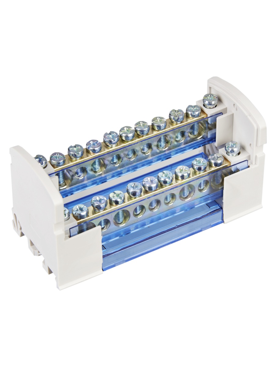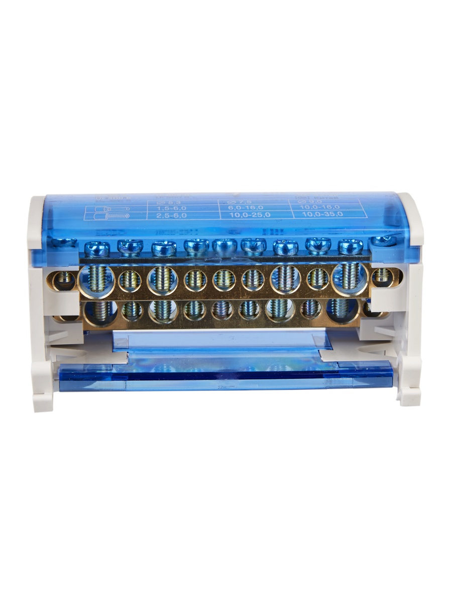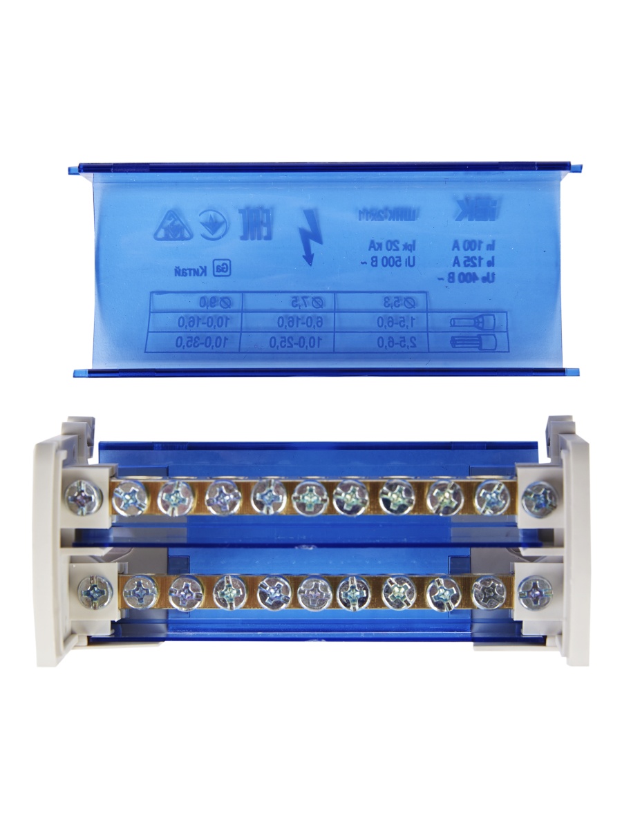 Шины выполнены из высококачественной латуни, изолирующая задняя панель и прозрачная защитная крышка выполнены из самозатухающего пластика.