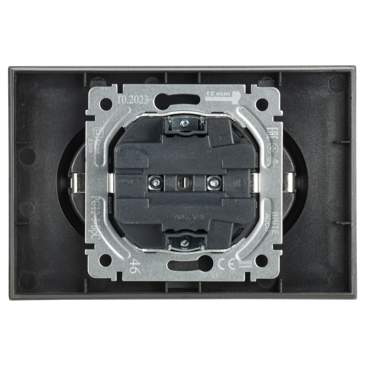 Наименование в прайсе производителя BRITE Розетка 2-местная с заземлением без защитных шторок 16А в сборе РС12-3-БрС сталь