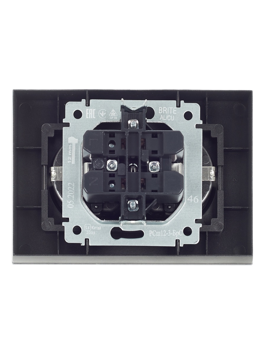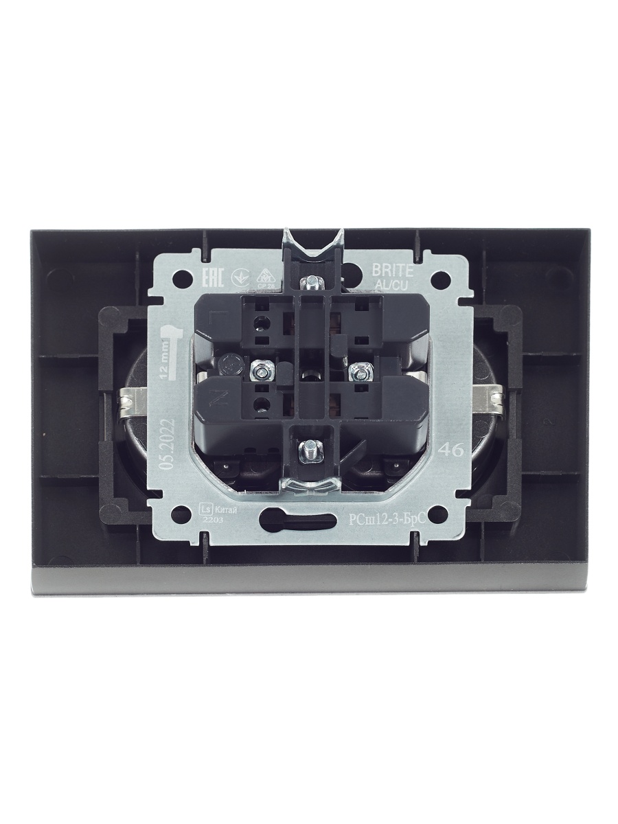 Наименование в прайсе производителя BRITE Розетка 2-местная с заземлением с защитными шторками 16А в сборе РСш12-3-БрС сталь