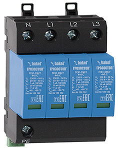 4-х полюсное УЗИП ограничивающего типа, предназначенное для защиты силовых цепей переменного 230 В (L/N, N/PE), ГСВ12-230/12,5 4+0 С | код 120 025 | Hakel
