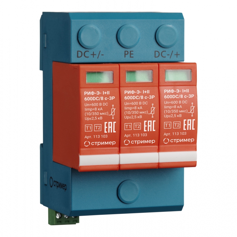 Устройство защиты от импульсных перенапряжений для систем постоянного тока РИФ-Э-I+II 600DC/8 с-3P УЗИП | код 113103 | Стример