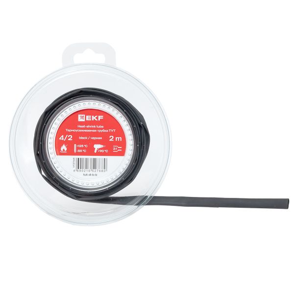 Термоусаживаемая трубка ТУТ нг 4/2 черная ролик 2 м EKF | код tut-4-b-b | EKF