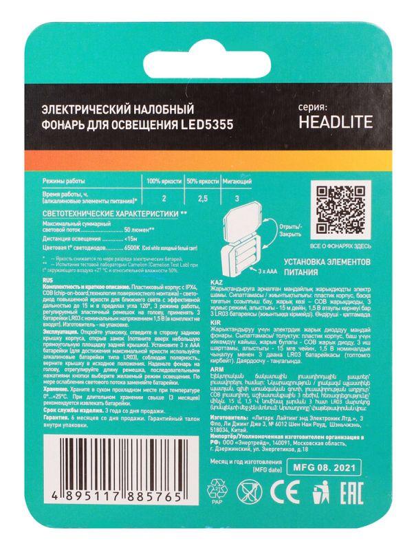 Фонарь налобный LED5355 1Вт COB LED 3 реж. 3XAAA пласт. блист. черн. Camelion 13748