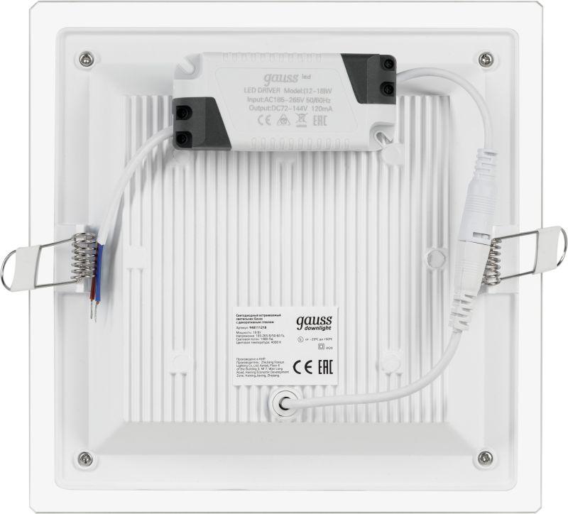 Светильник светодиодный Glass 18Вт 4000К IP20 1480лм 220-240В d155х155мм 200х200х30мм ДВО квадрат. встраив. монтажный с декоративн. стеклом GAUSS 948111218