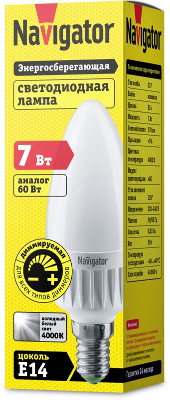 Лампа светодиодная 61 380 NLL-C37-7-230-4K-E14-FR-DIMM 7Вт свеча матовая 4000К нейтр. бел. E14 560лм 176-264В Navigator 61380