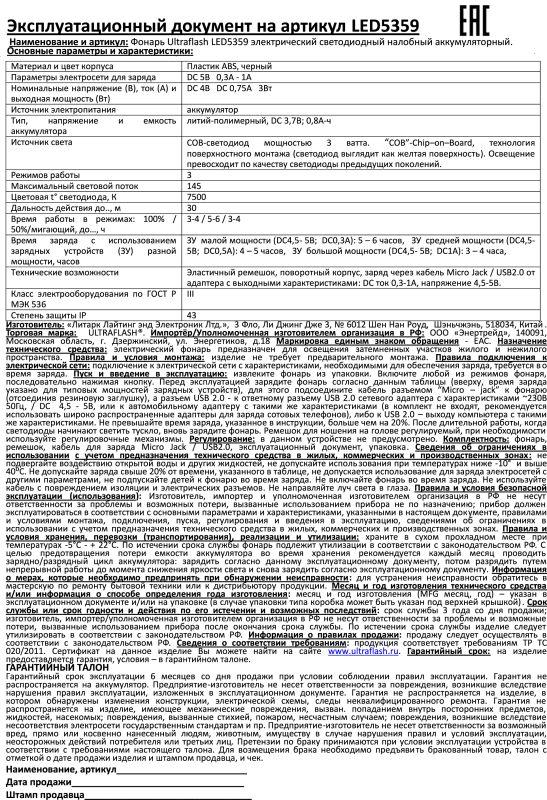 Фонарь аккумуляторный налобный LED5359 COB 3Вт 3 режима аккум. 5В пластик. черн. (бокс) Ultraflash 13803