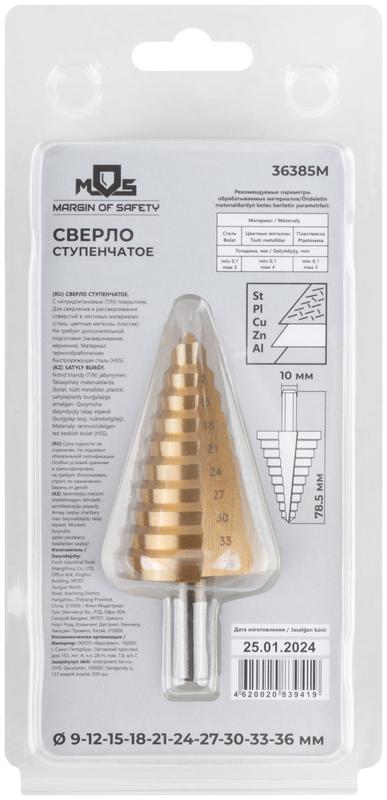 Сверло ступенчатое HSS по металлу, 10 ступеней 9-12-15-18-21-24-27-30-33-36 мм | код 36385М | FIT