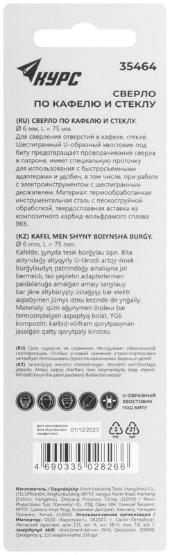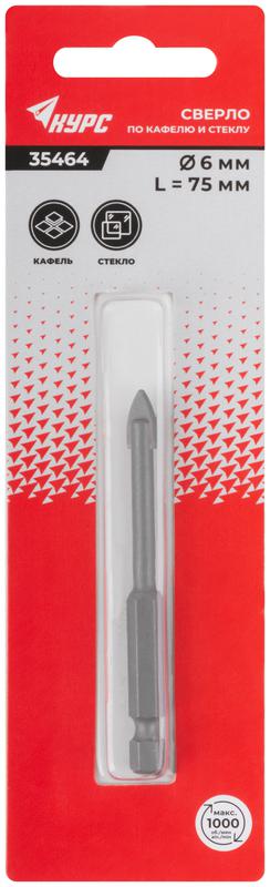 Сверло по кафелю и стеклу, шестигранный U-хвостовик под биту 6х75 мм | код 35464 | FIT