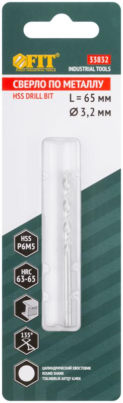 Сверло по металлу HSS полированное, центровочный наконечник, Р6М5, блистер 3,2х65 мм ( 1 шт.) | код 33832 | FIT