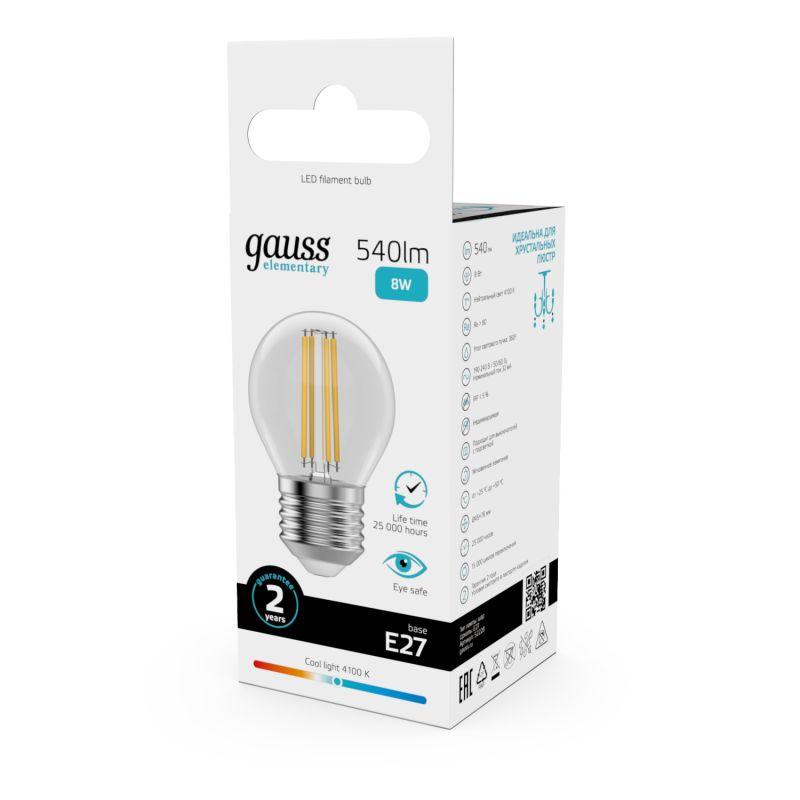 Лампа светодиодная филаментная LED 8 Вт 540 лм 4100К шар P45 нейтральный E27 AC 220В прозрачная колба Elementary Gauss | код 52228 | Gauss