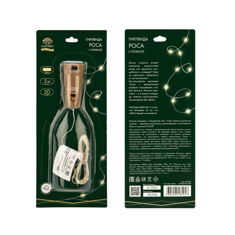 Гирлянда Роса с пробкой 2 м, 20 LED, теплое белое свечение, 3хLR44 в комплекте | код 302-026 | Neon-Night
