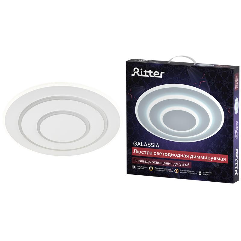 Люстра потолочная светодиодная диммируемая, GALASSIA, с ДУ, 3 режима, 470х470х55мм, 78Вт, 2700K+6400K/4200K/6400K+2700K, 35м, белый, 51580 1, Ritter | код 51580 1 | RITTER