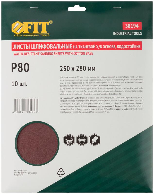 Листы шлифовальные водостойкие на тканевой основе, алюминий-оксидные, Профи 230х280 мм, 10 шт P80 | код 38194 | FIT