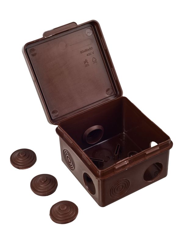 Коробка распределительная КМ 80х80х50мм для наружного монтажа с откидной крышкой IP54 7 вв. дуб | код UKO31-080-080-050-K24-54 | IEK