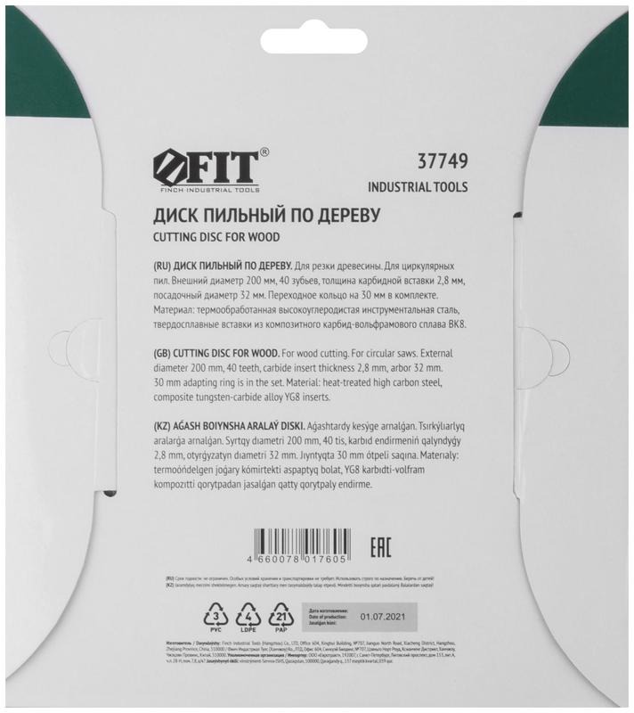 Диск пильный для циркулярных пил по дереву 200x32/30x40T | код 37749 | FIT
