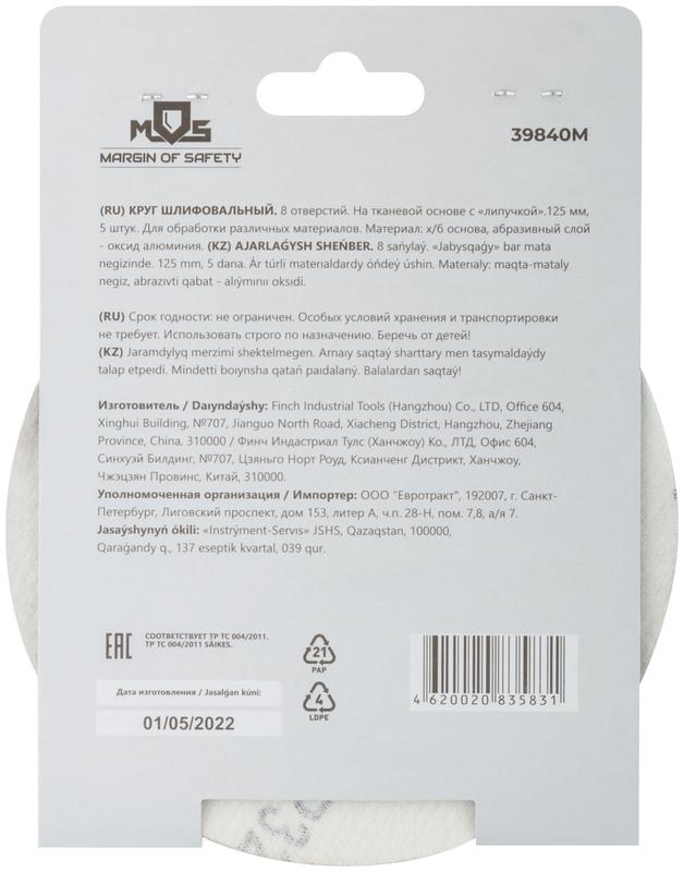 Круги шлифовальные с отверстиями (липучка), алюминий-оксидные, 125 мм, 5 шт. Р 320 | код 39840М | FIT