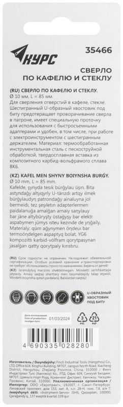 Сверло по кафелю и стеклу, шестигранный U-хвостовик под биту 10х85 мм | код 35466 | FIT