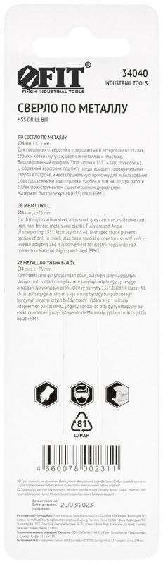 Сверло HSS по металлу,полированное, U-хвостовик под биту, инд.упаковка 4.0 мм | код 34040 | FIT