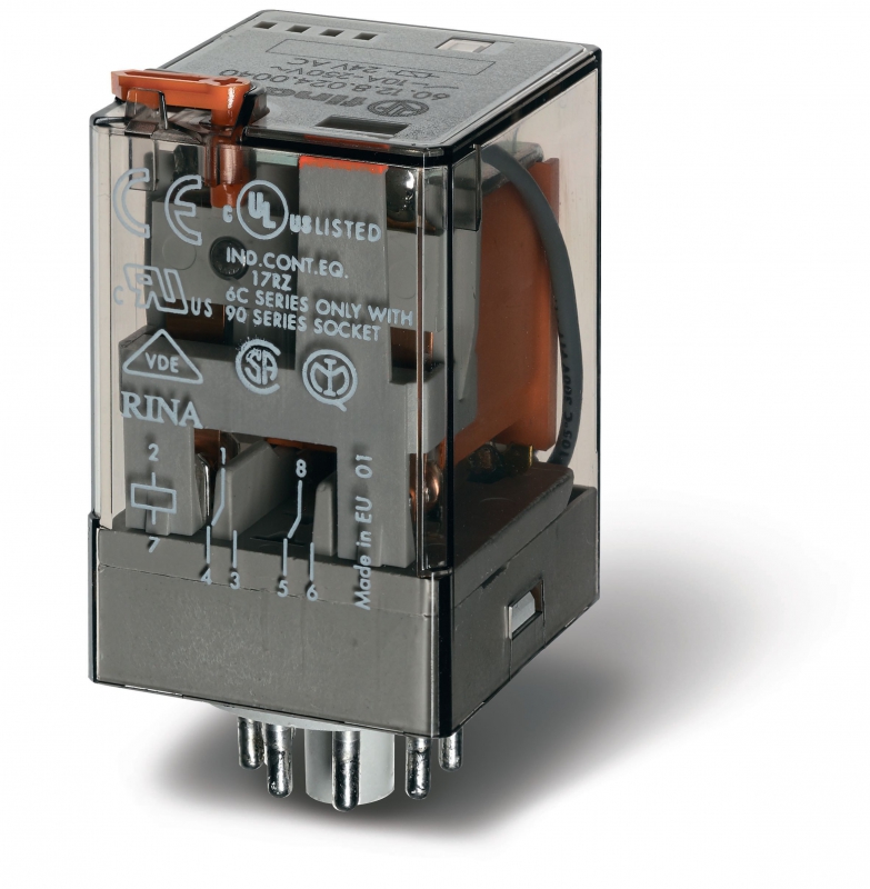 Универсальное электромеханическое реле, монтаж в розетку 8-штырьковый разъем, 2CO 10A, контакты AgNi, токовая катушка DC 1.0A, степень защиты RTI, опции: кнопка тест + мех.индикатор, упаковка 1шт. | код 601241020040PAS | FINDER