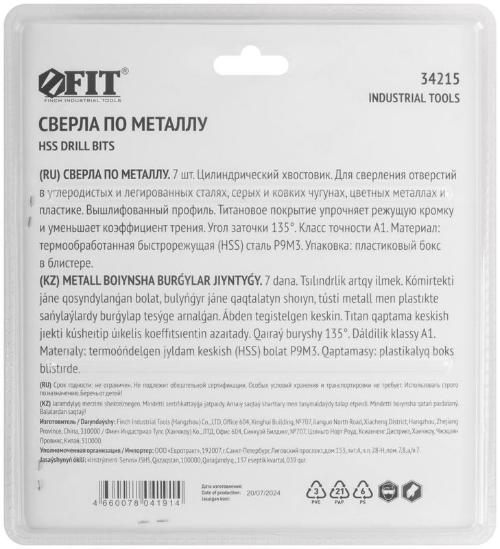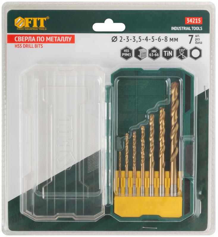 Набор сверл HSS пометаллу титановое покрытие (уп.7шт) (2-3-3.5-4-5-6-8мм) FIT 34215