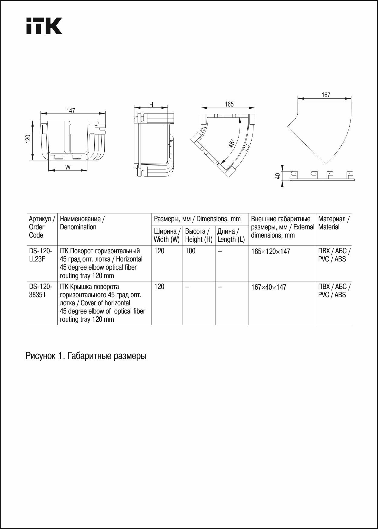 ITK Поворот горизонтальный 45град оптического лотка 120мм | код DS-120-LL23F | IEK