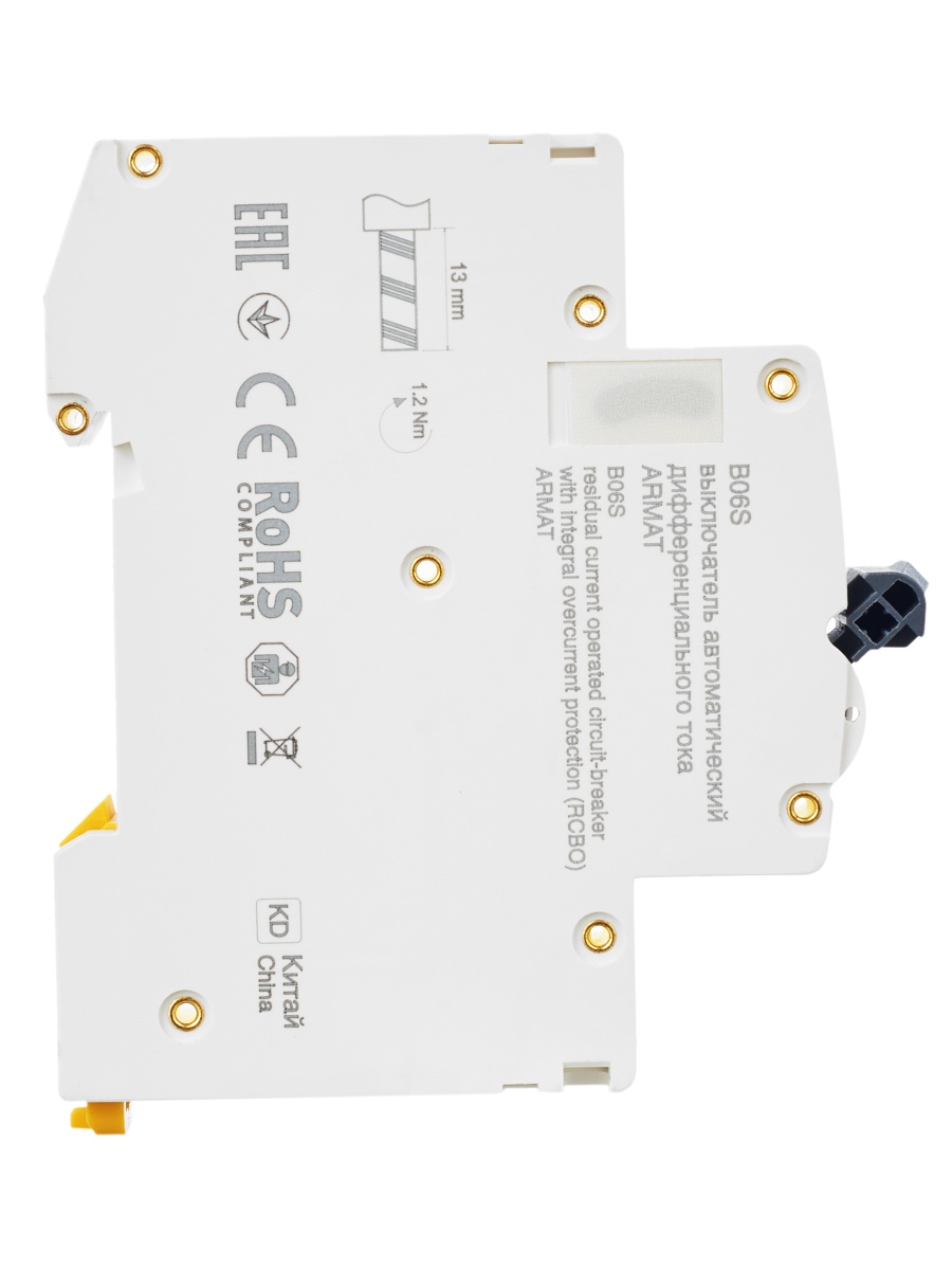 Наименование в прайсе производителя ARMAT Автоматический выключатель дифференциального тока B06S 1P+NP C6 30мА тип A (18мм)