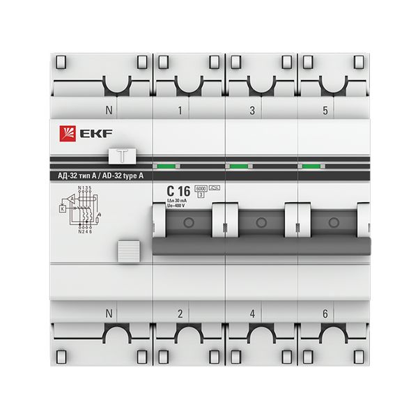 Наименование в прайсе производителя Дифференциальный автомат АД-32 3P+N 16А/30мА (хар, C, A, электронный, защита 270В) 6кА EKF PROxima