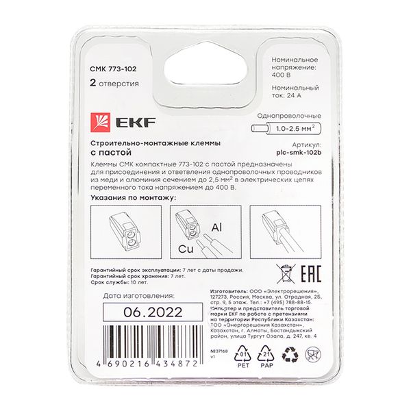 Наименование в прайсе производителя Строительно-монтажная клемма СМК 773-102 2 отверстия 1,0-2,5мм2 блистер (5шт,) EKF PROxima