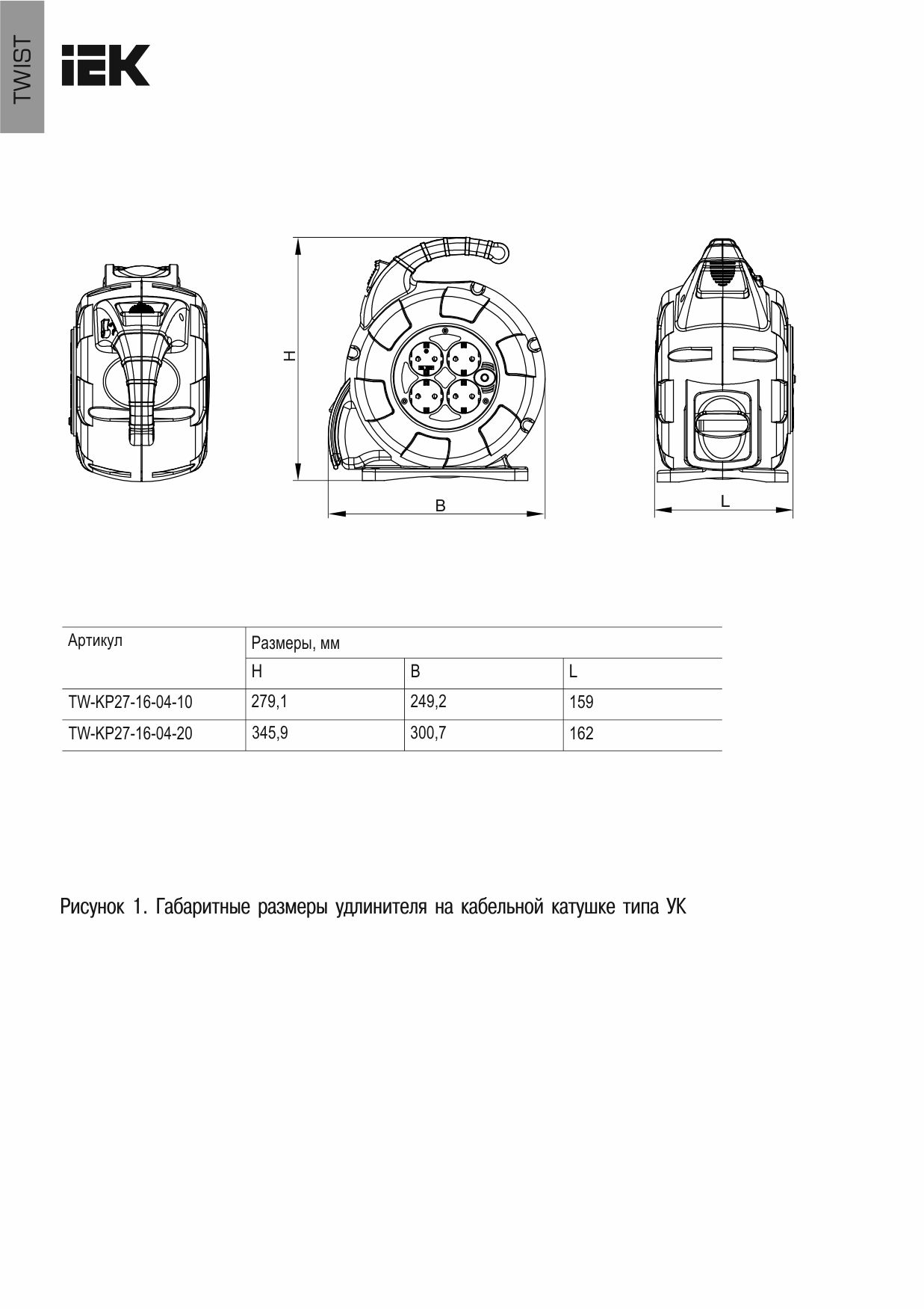 Удлинитель на катушке TWIST 4х20м с заземл. автосмотка 16А IP20 ПВС 3х1.5 | код TW-KP27-16-04-20 | IEK
