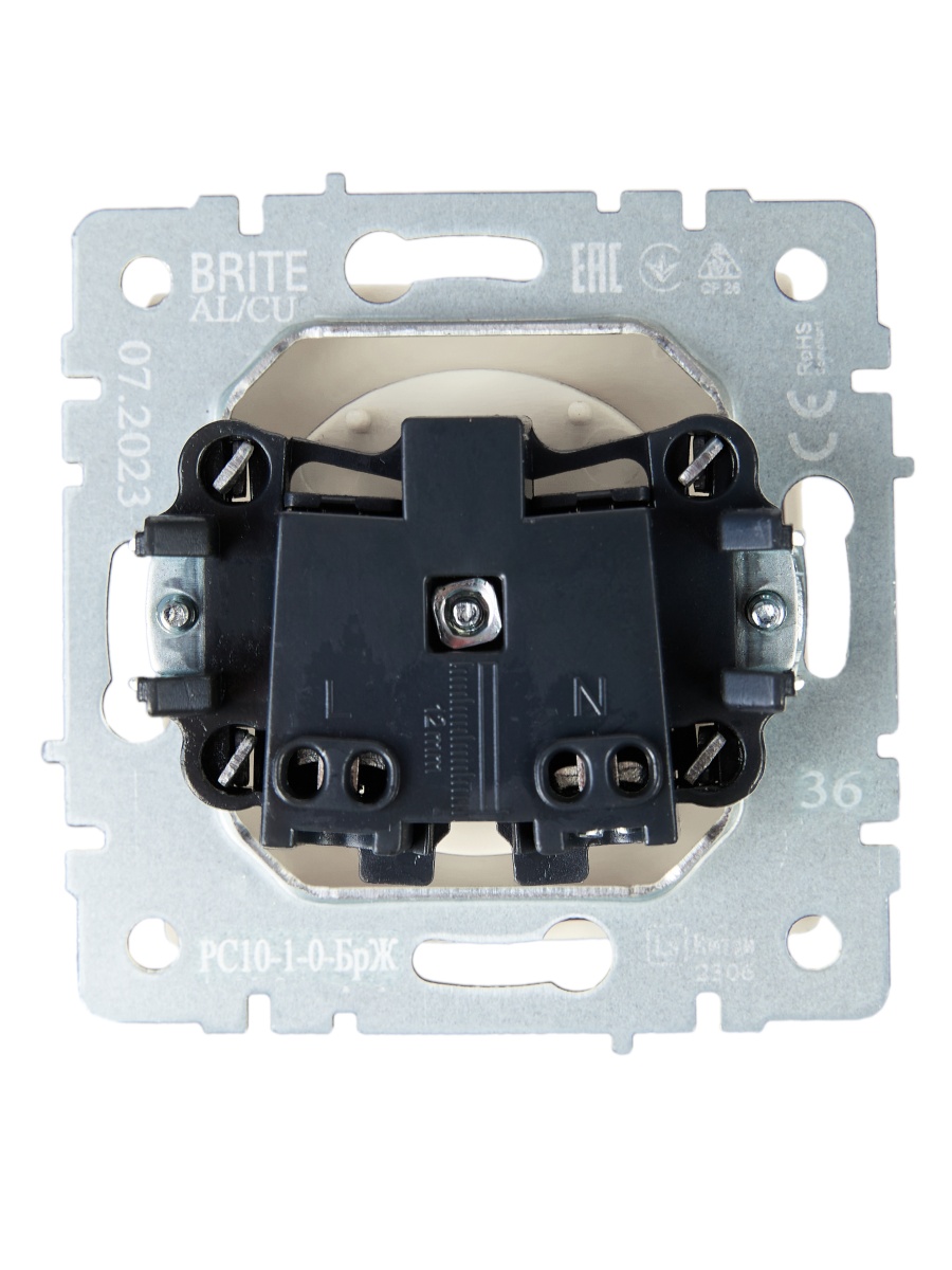 Наименование в прайсе производителя BRITE Розетка 1-местная без заземления без защитных шторок 10А РС10-1-0-БрЖ жемчуг