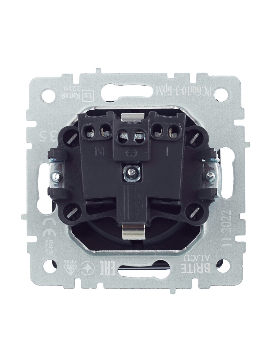 Наименование в прайсе производителя BRITE Розетка 1-местная с заземлением с защитными шторками и крышкой 16А IP20 РСбш10-3-БрМ маренго