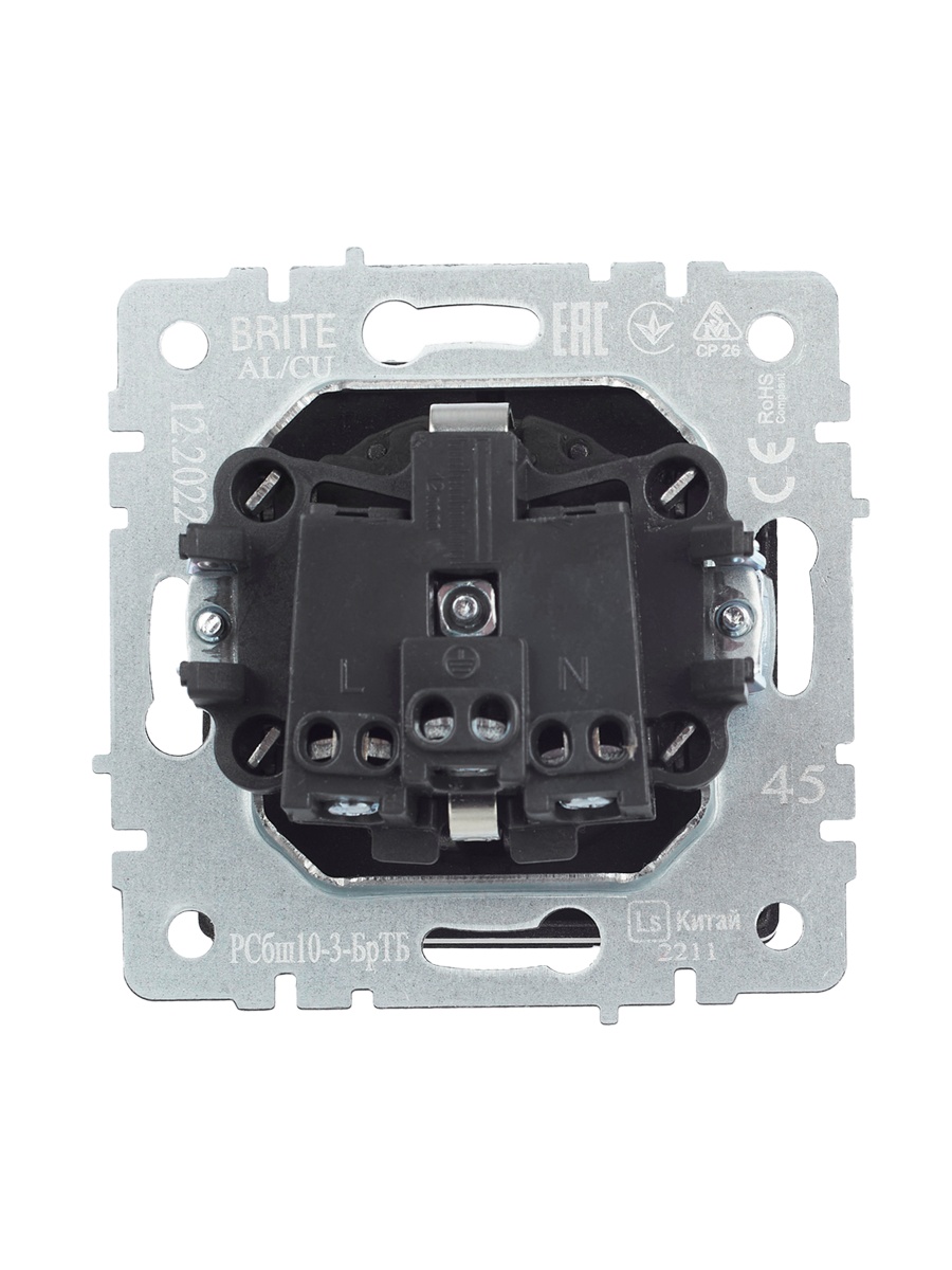 Наименование в прайсе производителя BRITE Розетка 1-местная с заземлением с защитными шторками и крышкой 16А IP20 РСбш10-3-БрТБ темная бронза
