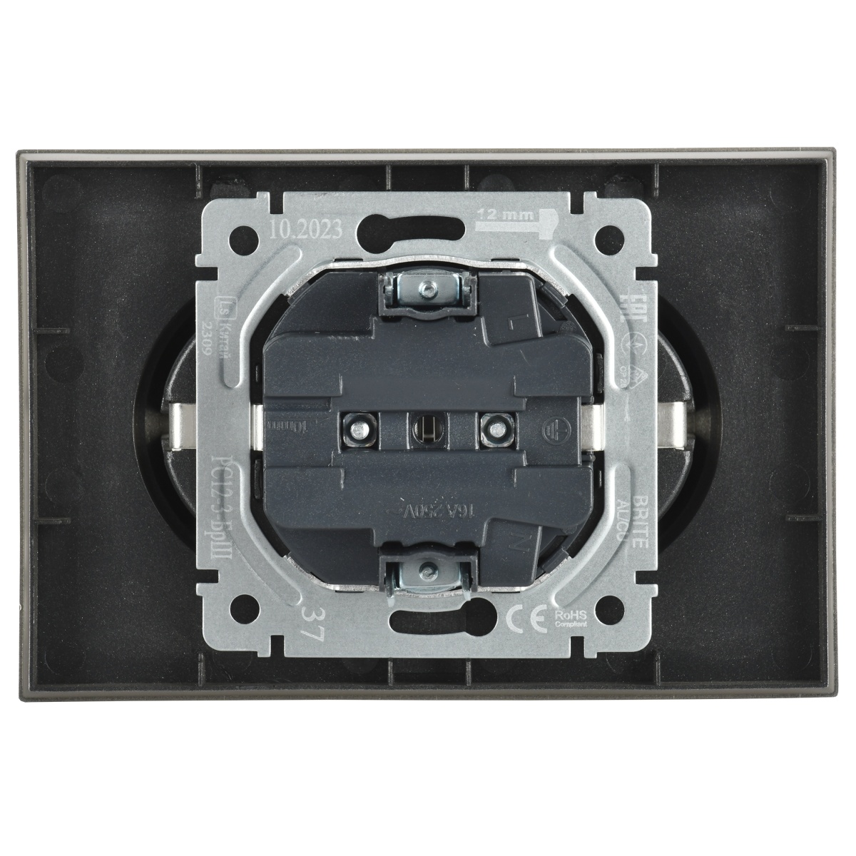 Наименование в прайсе производителя BRITE Розетка 2-местная с заземлением без защитных шторок 16А в сборе РС12-3-БрШ шампань