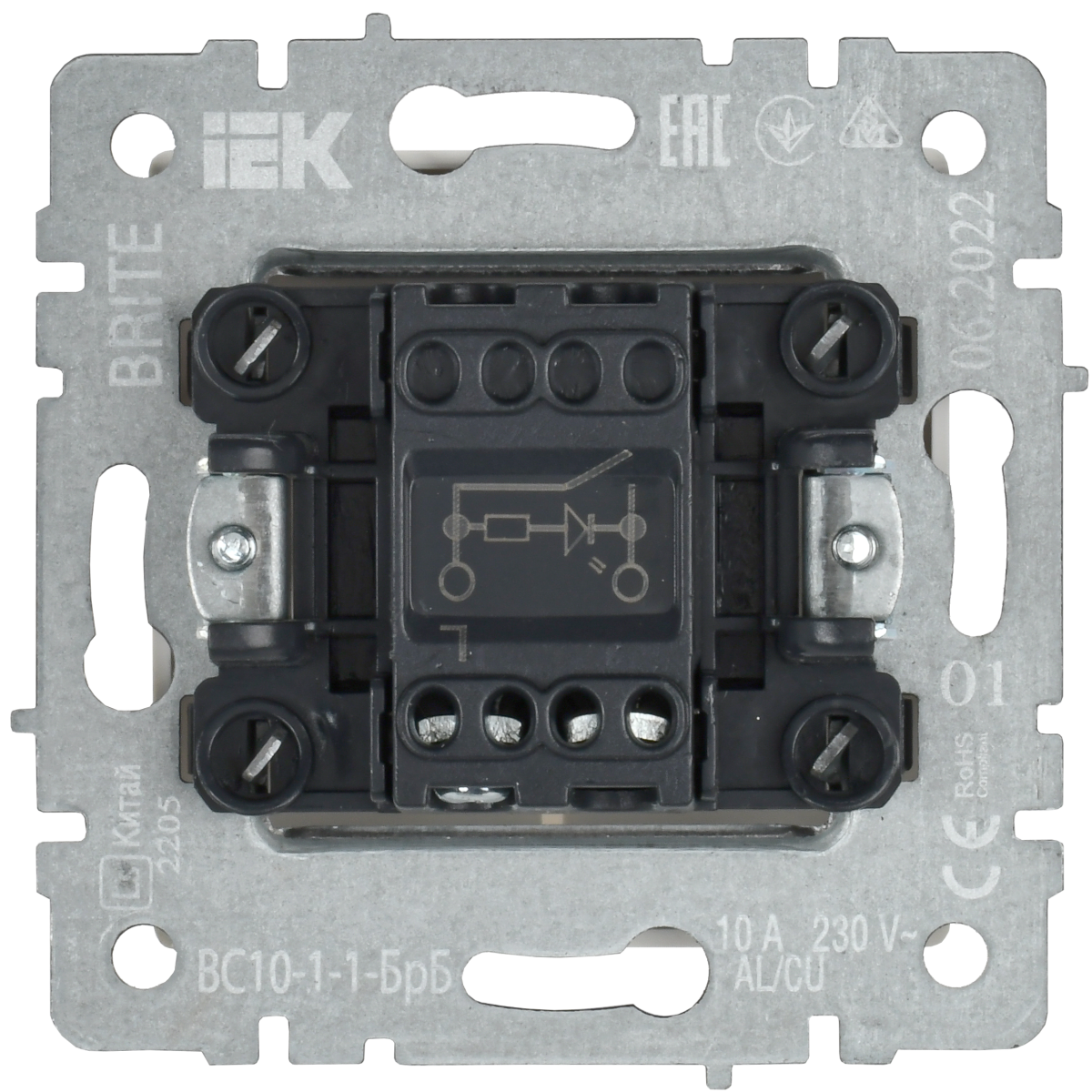 Наименование в прайсе производителя BRITE Выключатель 1-клавишный с индикацией 10А ВС10-1-1-БрБ белый