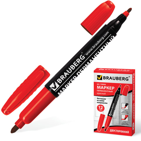 Маркер перманентный (нестираемый) BRAUBERG двусторонний, КРАСНЫЙ, круглый наконечник, 2-4 мм, 150838 | код 150838 | BRAUBERG