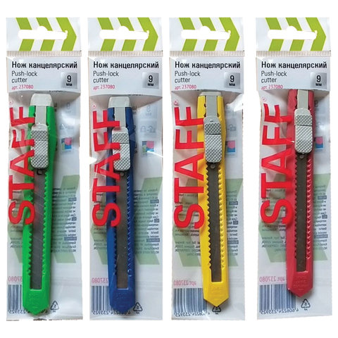 Нож универсальный 9 мм STAFF Economy, фиксатор, клип, корпус ассорти, 237080 | код 237080 | STAFF