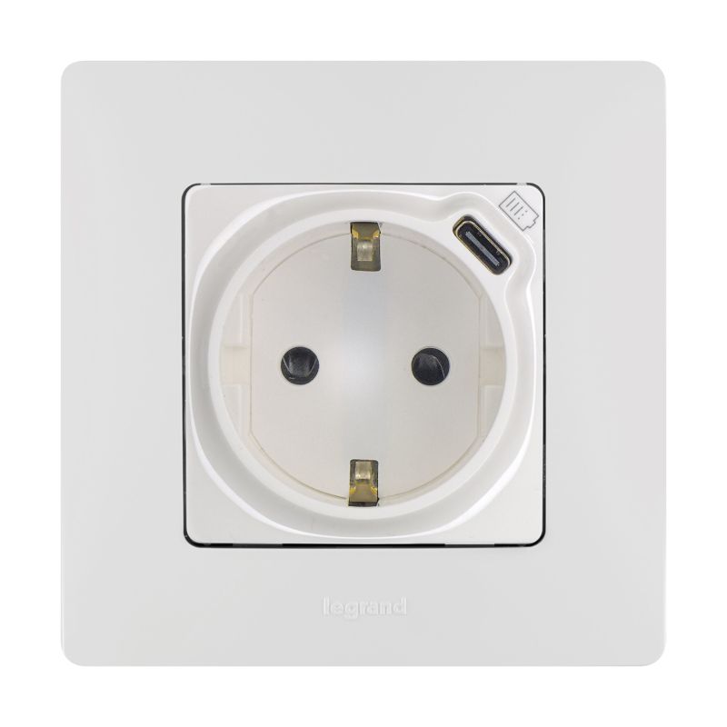 Розетка с заземлением с USB тип C - Etika - со шторками 16А 250В 1500мА 7,5Вт безвинтовые зажимы - белая | код 672288 | Legrand