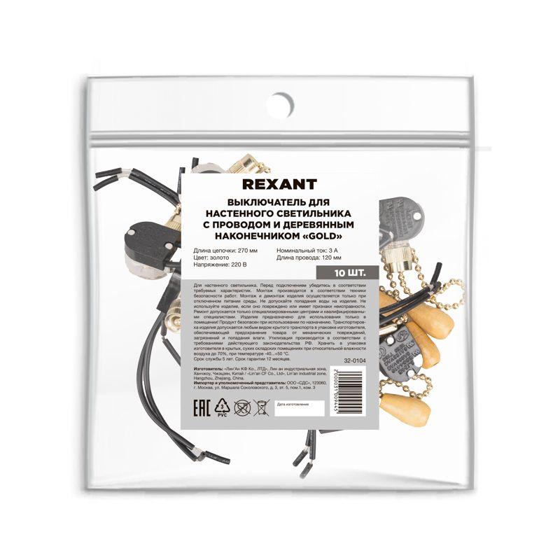 Выключатель для настенного светильника c проводом и деревянным наконечником ''Gold'' | код 32-0104 | REXANT