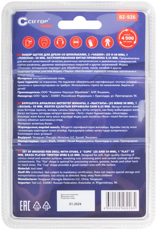 Набор щеток для дрели, 3 шт., Чашки 25, 50 мм, Плоская 50 мм, латунированная витая проволока, блистер, Profi | код 82-926 | FIT