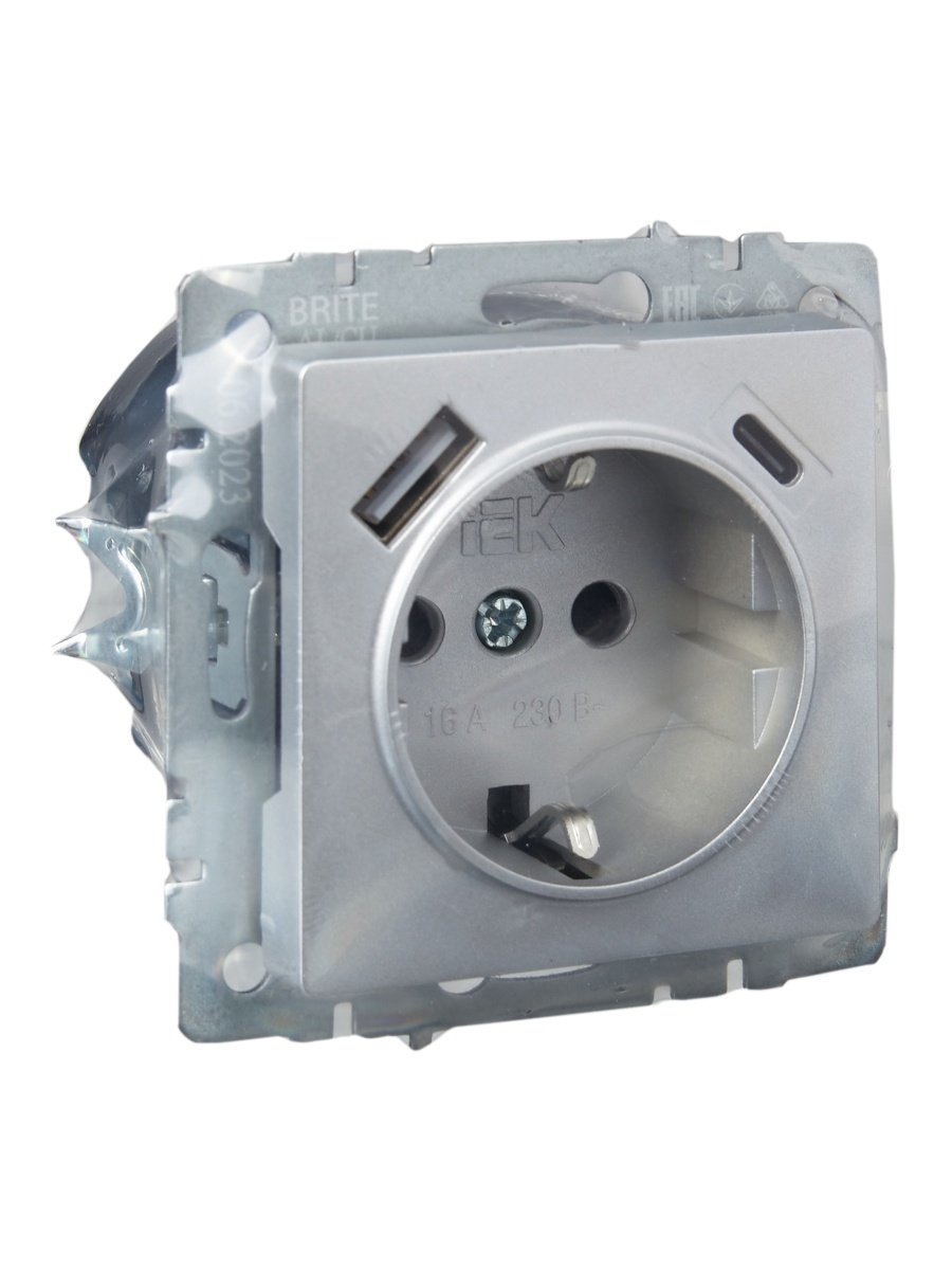 Розетка BRITE РЮш11-1-БрА 16А с USB A+C 18Вт с заземл. защ. шторки алюм. | код. BR-R14-16-U22-018-K47 | IEK
