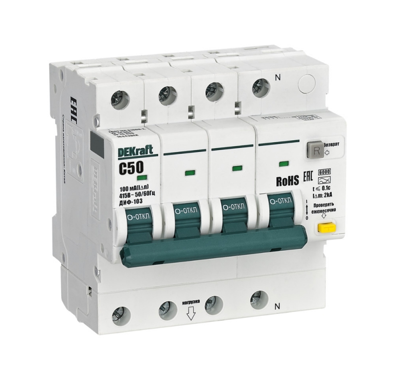 АВДТ 3P+N 50А 100мА A х-ка C ДИФ-103 6кА | код 16442DEK | DEKraft