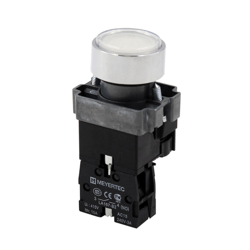 Кнопка плоская белая с подсветкой, 220V AC/DC, 1NO, IP67, металл MTB2-BWF3161 | код 132651 | MEYERTEC