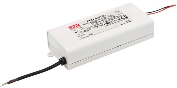 Источник питания AC-DC, 60Вт, ККМ, стабилизация тока, вход 180…295В AC, 47…63Гц, выход 2.4A/15…25В, изоляция 3750В AC, в кожухе 128х60х31.5мм, -30…+45С, возможность подключения диммера на входе | код PCD-60-2400B | MeanWell