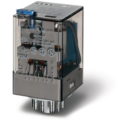 Универсальное электромеханическое реле, монтаж в розетку 11-штырьковый разъем, 3CO 10A, контакты AgNi, токовая катушка AC 0.4A, степень защиты RTI, опции: кнопка тест + мех.индикатор, упаковка 1шт. | код 601340410040PAS | FINDER