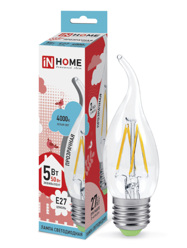 Лампа светодиодная LED-СВЕЧА НА ВЕТРУ-deco 5Вт 230В Е27 4000К 450Лм прозрачная IN HOME | код 4690612007656 | IN HOME